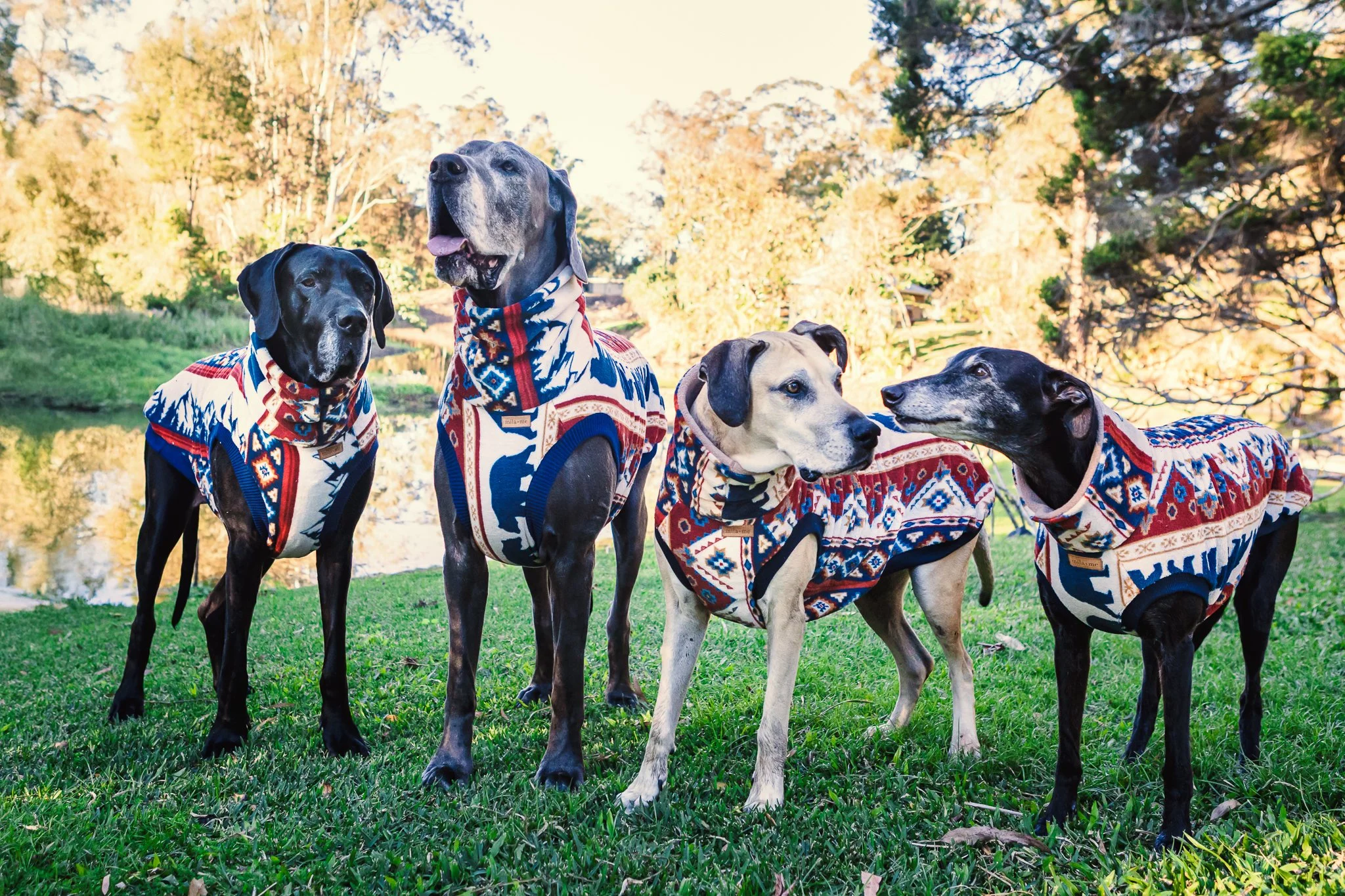 Our main quality controllers are Mila (black Great Dane) and Takara (blue Great Dane). Takara, called ‘Tak’, joined our family in August 2020 and soon became Mila's very best friend and a key part of Mila & Me. Mila, Tak, Penny (Greyhound), and Lucy (Dane mix) are our main models, featuring in most of our product shoots.