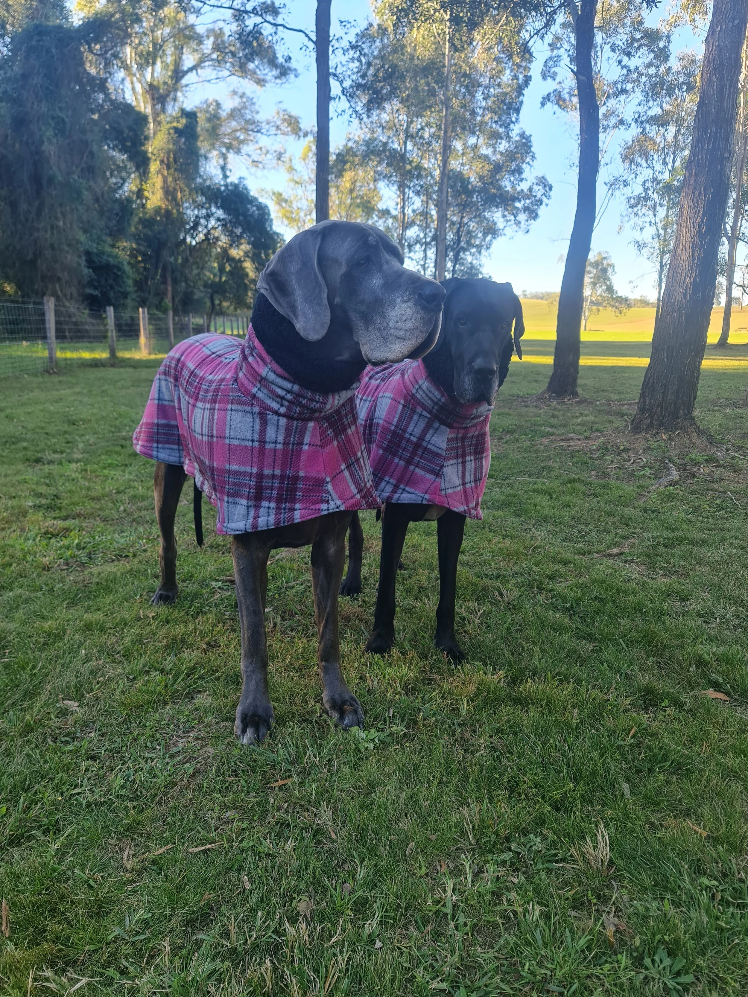 This coat is in stock and ready to send. Made in our Standard Great Dane size, please refer to our size chart in the images of this listing for measurements. Made in our ‘Grey & Pink plaid ’ fleece fabric with black fleece lining and finished with deluxe sherpa style fleece to collar.